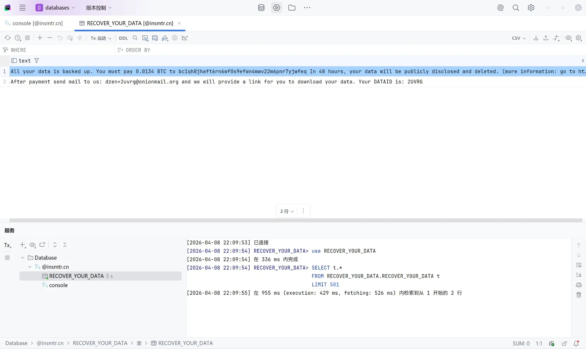 这学期有一周软件设计课设,需要写一个网页版的学生选课系统。我直接在自己的服务器上跑了一个 MySQL 的容器,为了方便,容器直接暴露了 3389 端口,用户密码直接设置成了 root。验收完之后的某天,我想欣赏一下我的网页,结果发现后端起不来了,一看报错是数据库连不上了。我打开 DataGrip 一看,好家伙,被勒索了。